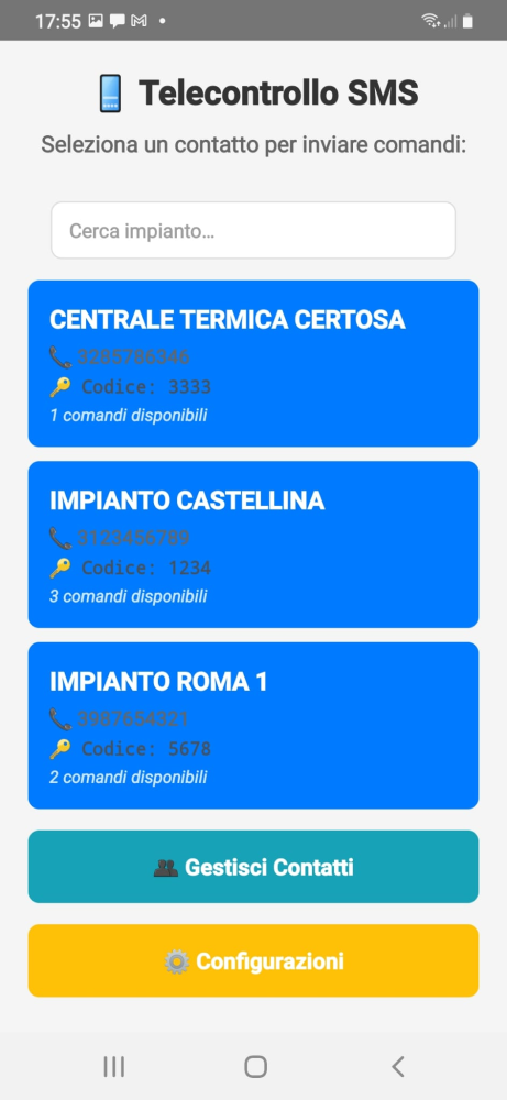 QUI SI POSSONO VEDERE DUE SCHERMATE DELLA APP DI CONTROLLO CON LA QUALE E' POSSIBILE GESTIRE TUTTI GLI IMPIANTI CHE VOLETE , QUESTI VENGONO ELENCATI ALL'AVVIO DELLA APP , POSSONO ESSERE RICERCATI CON LA FUNZIONE DI RICERCA PREMENDO SUL NOME SI ENTRA NEI COMANDI DEL SINGOLO IMPIANTO.