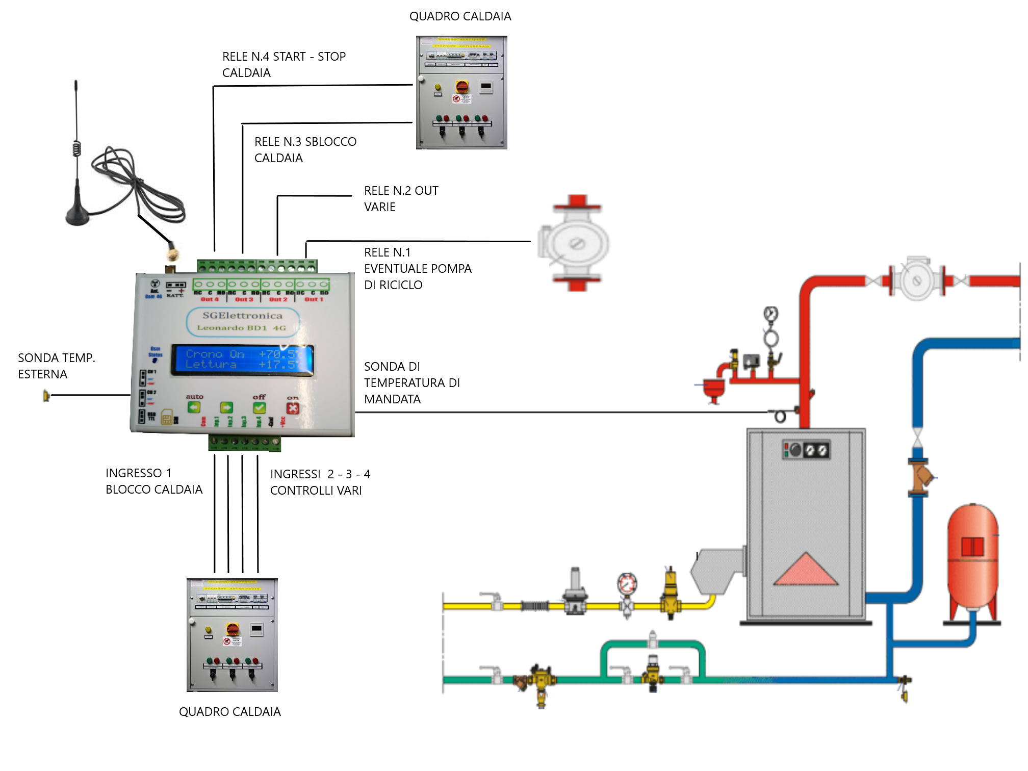 L'IDEA E' QUELLA DI SOSTITUIRE IL CRONO NEL QUADRO VECCHIO CON IL LEONARDO BD1 4G CRONOTERMOSTATO CHE ACCENDERA' LA CALDAIA AGLI ORARI PROGRAMMATI ED INOLTRE QUANDO DOVETE CAMBIARE ORARIO OPPURE ACCENDERE O SPEGNERE , FARE UN RESET ALLA CENTRALE LO POTETE FARE DA REMOTO SENZA SPOSTARVI CON UN NOTEVOLE RISPARMIO DI TEMPO E DENARO. AVRETE ANCHE LA POSSIBILITA' TRAMITE GLI INGRESSI DI ESSERE AVVERTITI CON SMS DI UN MALFUNZIONAMENTO. E' POSSIBILE IMPOSTARE UNA TEMPERATURA DI ALLARME A SALIRE O SCENDERE CHE SE RAGGIUNTA VI VERRA' INVIATO UN ALLARME SMS , SI PUO' ATTIVARE UNA FUNZIONE CHE AD OGNI AVVIO DELLA CALDAIA DOPO UN TEMPO IMPOSTATO VA A VEDERE LA TEMPERATURA DI MANDATA E SE E' SOTTO IL LIVELLO IMPOSTATO VIENE INVIATO UN SMS DI ALLARME. QUINDI AVRETE LA CERTEZZA CHE LA CALDAIA STA FUNZIONANDO IN MANIERA REGOLARE. QUESTI SONO ALCUNI ACCORGIMENTI CHE DAGLI IMPIANTI GIA' MONTATI SI SONO RIVELATI MOLTO UTILI.